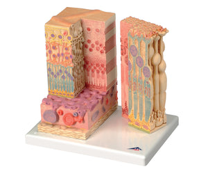 The MICROanatomy™ Eye model illustrates the microscopic anatomical structure of the retina with choroid and sclera. The left block-like, layered side of the eye model shows the complete structure of the retina including the supplying vascular layer and parts of the sclera from a light microscopic view. The right part of the eye model is a sectional enlargement. MICROanatomy™ Eye shows the microscopic structure of the photoreceptors and the cells of the pigmented layer. Left part of MICROanatomy™ Eye 850-times enlarged - right part 3800-times enlarged. You've never seen the human eye like this before!