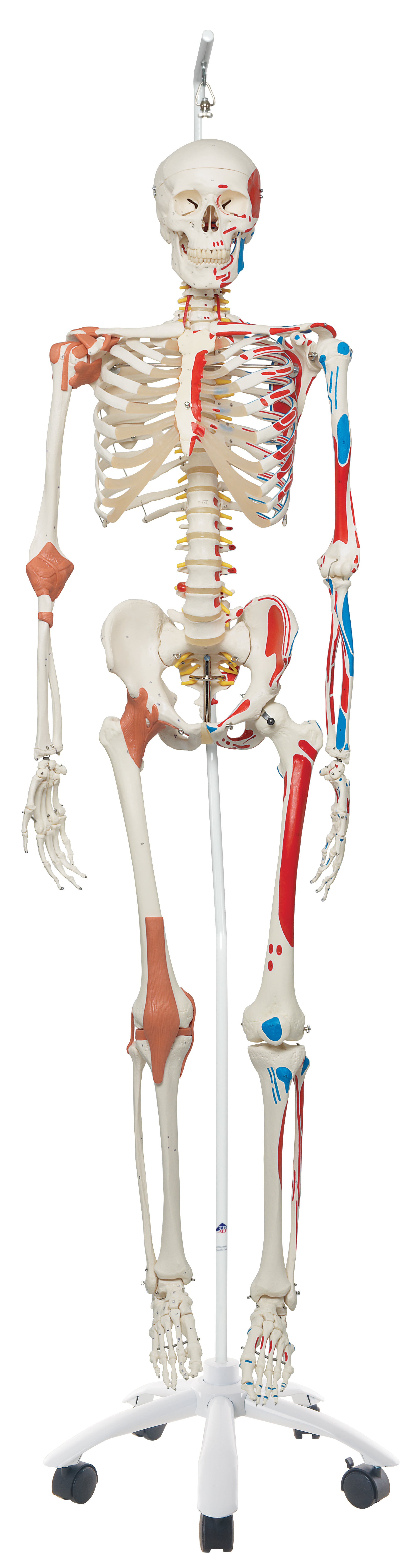 In addition to these features the relationship between the muscle system and skeletal system is easily displayed with the muscle origins and insertions hand painted on the skeleton. This muscle skeleton is a great addition to any anatomy or biology classroom.
