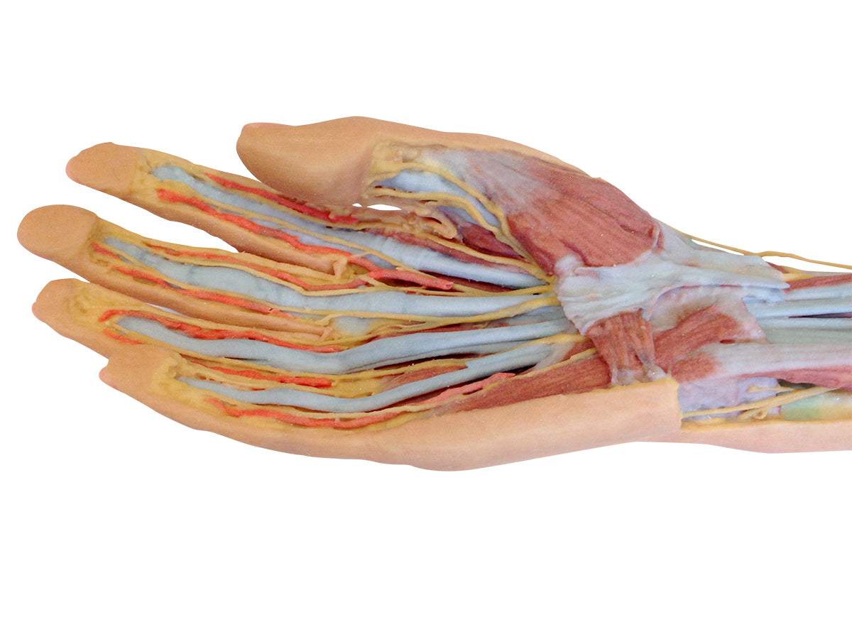 This 3D printed specimen preserves a mixed superficial and deep dissection of the anterior aspect of a right distal arm, forearm and hand.