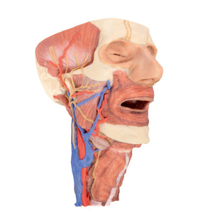 This 3D print specimen preserves a series of features of the head and visceral column of the neck: The face: On the right side of the head the parotid gland has been removed to reveal the facial nerve and all its branches (temporal, zygomatic, buccal, marginal mandibular and cervical) and demonstrate the spatial relations of structures embedded in the gland from superficial to deep (facial nerve, retromandibular vein, external carotid artery). In the surrounding region the temporalis, masseter and posterior belly of digastric are exposed, as are and the facial artery, transverse facial artery and superficial temporal artery. The facial vein and transverse facial vein are clearly visible uniting to form the common facial vein which is joined by the retromandibular vein to form the external jugular vein.