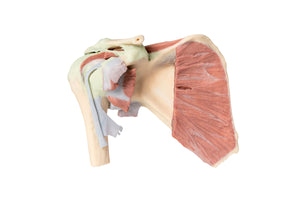 This 3D printed specimen preserves a deep dissection of a right shoulder girdle, consisting of a complete scapula, lateral clavicle, and proximal humerus. In the anterior view, the subscapularis muscle is present but sectioned to highlight the cross-sectional thickness of the belly within the subscapular fossa.