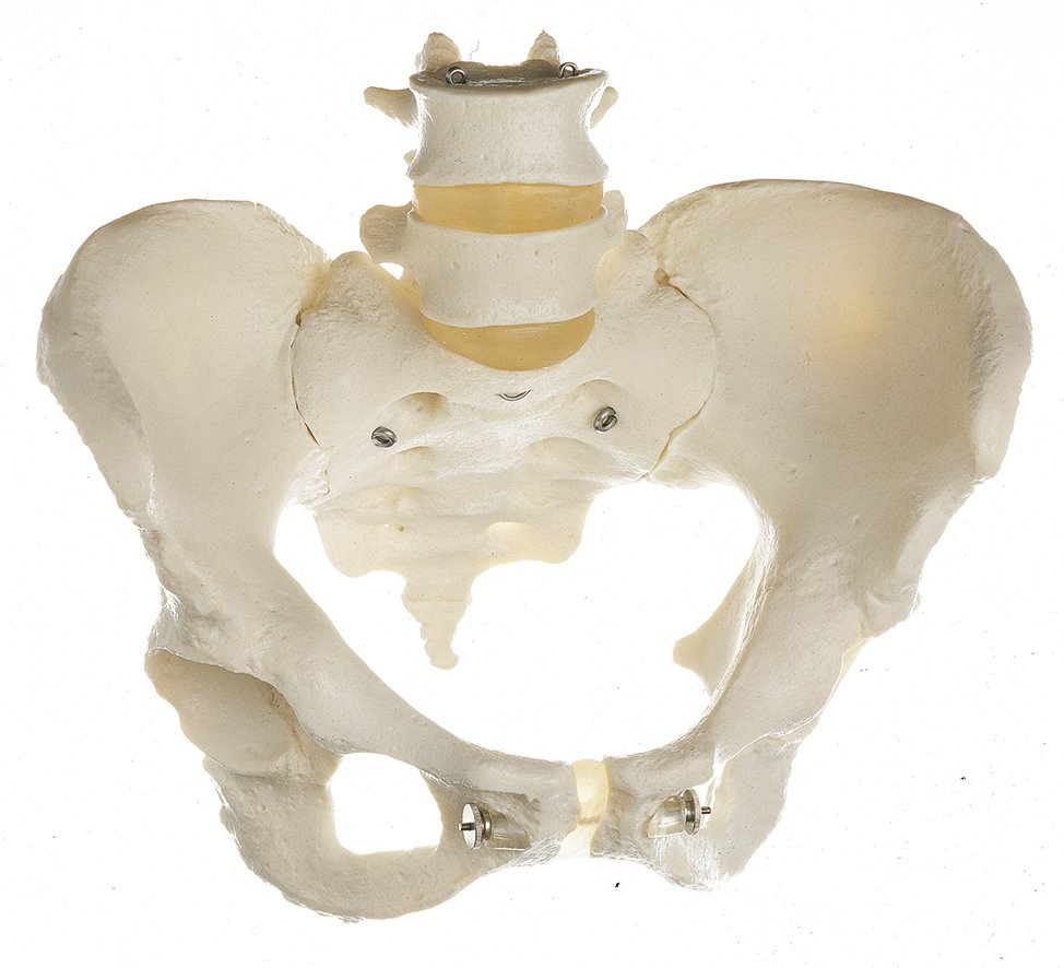 Cast from natural specimen in SOMSO-Plast®. Consisting of the two upper parts of ilium sacrum and coccyx and 4th and 5th lumbar vertebrae as well as the discs and symphysis. Mounted.