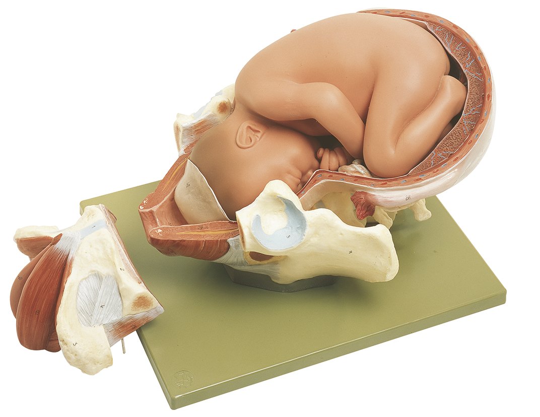 Natural size in SOMSO-Plast®. The model shows the beginning of the birth process. Formation of the amniotic sac. Separates into 3 parts. On a green base.