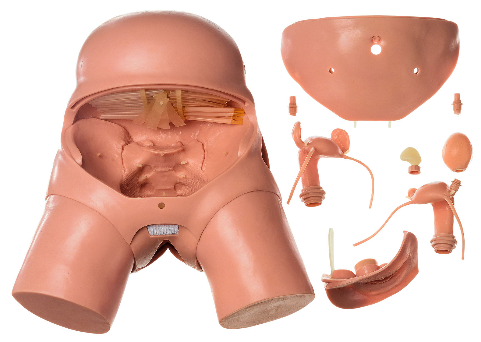 using the Dr. Simon method The model consists of a rigid plastic mass and corresponds to the actual size of a normal woman. The model has been designed mainly for the simulation of all pelviscopic operations. Many operations are made possible by the number of openings.