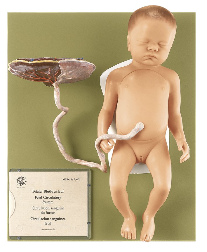 Natural size in SOMSO-Plast®. The model shows a female fetus at the end of the pregnancy with placenta and umbilical cord. Separates into 13 parts: placenta umbilical cord abdominal cover lungs (2) heart (2) thymus diaphragm liver (2) stomach and intestine body. On a green base.