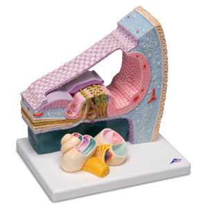 The model shows a three dimensional section through the organ of Corti, the site of the sense of hearing in the inner ear in humans. Special attention has been given to the detailed representation of the individual cellular components and membranes. The overview model in the foreground also shows the exact location of the organ in the cochlea.