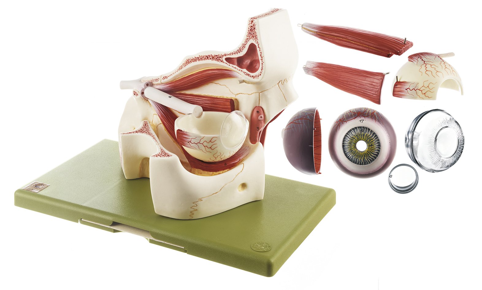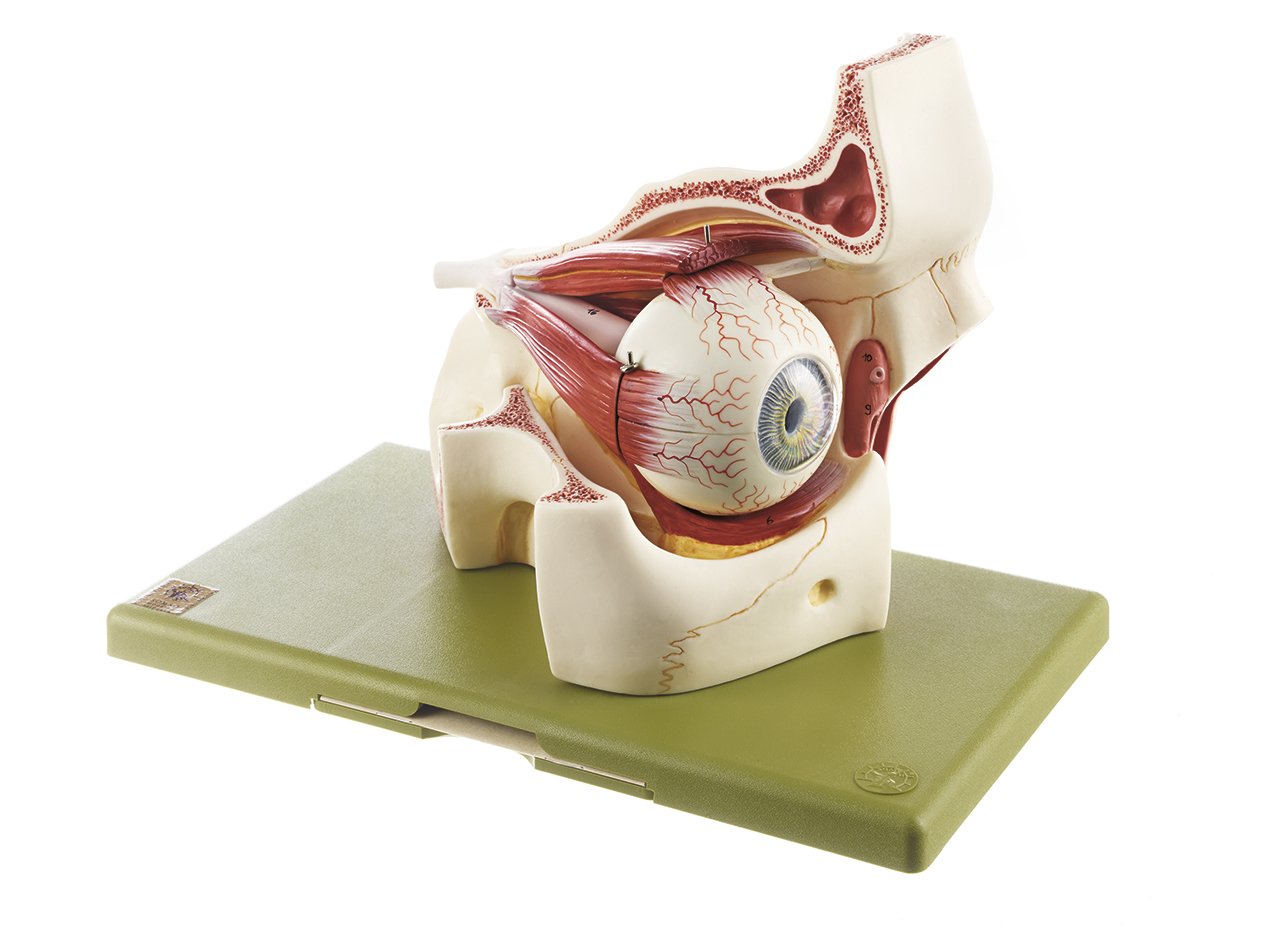 Enlarged approx. 3 times in SOMSO-Plast®. All six muscles of the eye are represented. The optic nerve is shown up to where it enters the green base of the skull the eyeball is sectioned horizontally. Separates into 8 parts: superior rectus and exterior straight muscle upper half of the sclerotic membrane choroid membrane and retina (2) vitreous humour lens orbit with green base.