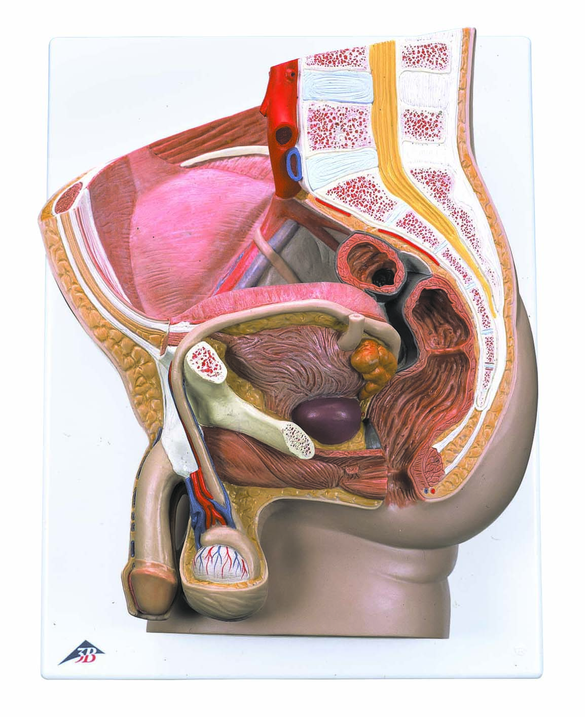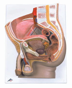 The male pelvis anatomy model is shown in median section. One half of male genital organs with bladder is shown at the normal position in the male pelvis. The rectum is removable for a more detailed study of the male pelvic anatomy. This high quality anatomy model is delivered on baseboard offering the possibility to be mounted to the wall.