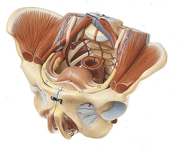 Natural size in SOMSO-Plast®. Representation of the external and internal genital organs with the pelvic muscles and the muscles of the pelvic floor as well as the network of nerves and vessels. Separates into 4 parts: pelvis median section (2 parts) and removable inner organs (2 parts).