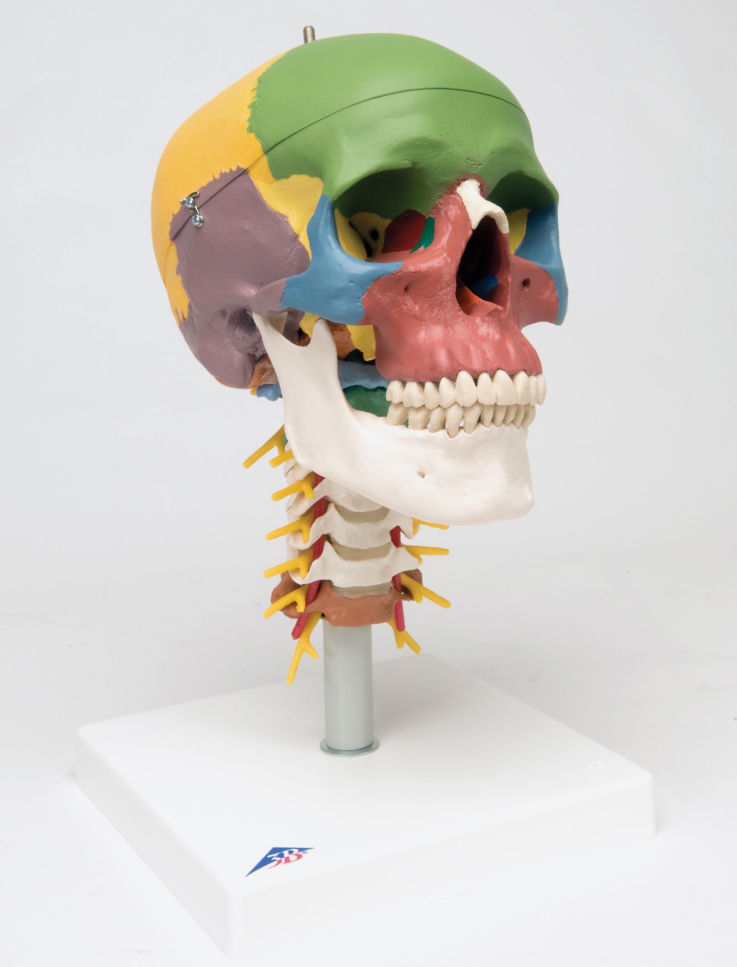 This human skull model uses 19 didactic colors to show the shapes and relationships of the various bone plates of the skull. This human skull replica is flexibly mounted on the cervical spine (C1, C2 and C7 are colored). The didactic model also exhibits the hindbrain, spinal cord, spinal nerves of the cervical spine, vertebral arteries, basilar artery and rear cerebral arteries. The plastic skull can be removed from its stand.