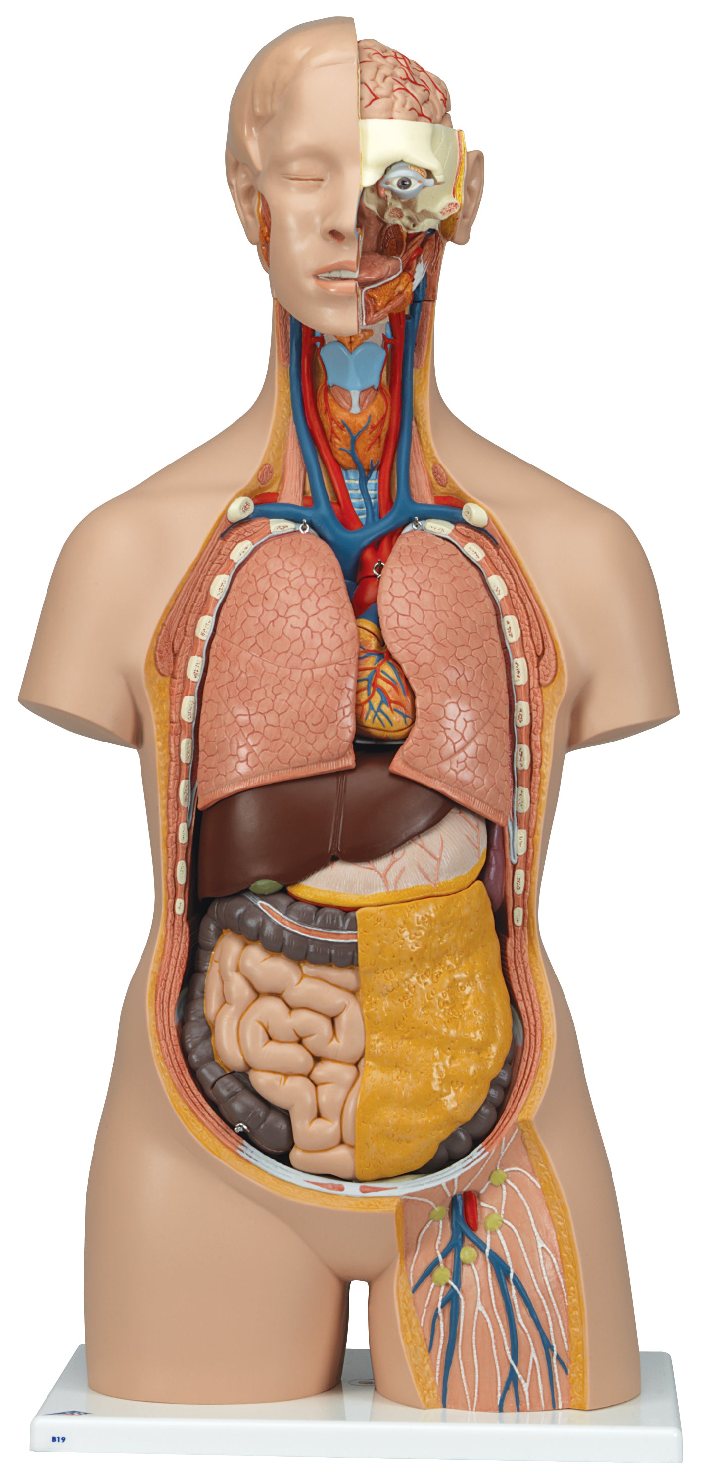 This classic torso is hand-painted true to detail and made of high-quality plastic. All 3B torsos are also developed and modeled in Germany. This human unisex torso model has the unique feature of an open neck and back section going from the cerebellum to the coccyx. Vertebrae, intervertebral discs, spinal cord, spinal nerves, vertebral arteries, and many other features are represented in detail in this colorful replica of the human anatomy This human torso model includes the following removable parts and organs: