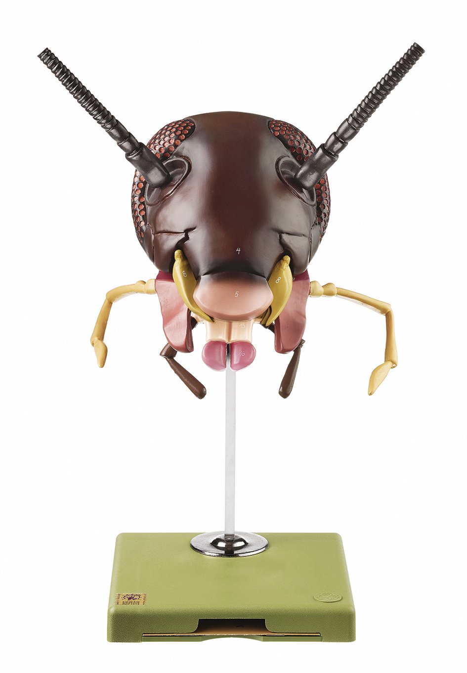 Periplaneta americana. After Dr. E. Schicha. Modelled from nature. Enlarged approx. 50 times in SOMSO-Plast®. Upper jaw and maxillae are movable and mounted to demonstrate the function. Separates into 3 parts. On a stand with green base.