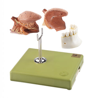 Natural size in SOMSO-Plast®. Median section with one part of the lower jaw removable. Separates into 3 parts. On a stand with green base.