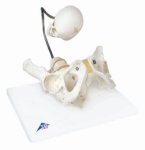 This childbirth model demonstrates the progress of the fetal head through the pelvis during birth. The childbirth demonstration pelvis simulator consists of a female pelvic skeleton with a movable symphysis, hip bone, sacrum, coccyx and 2 lumbar vertebrae articulated to accommodate passage of a fetal skull mounted on an omni positioning flexible gooseneck support. A realistic anatomical replica of the childbirth process. Childbirth pelvis delivered on baseboard.