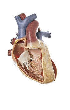 With defect of atrium and ventricular septum Ductus Botalli enlarged approx. 3 times in SOMSO-Plast®. The typical feature of the congenital anomaly is for the aorta to arise from the anterior (right) cardiac chamber (ventricle). In one piece removable from green base.