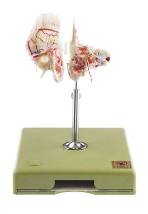 Natural cast in SOMSO-Plast®. The opened tympanic cavity shows the tympanic membrane the three auditory ossicles the cochlea and the semicircular canals. Separates into 2 parts. On a stand with green base.