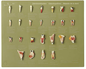 Natural size teeth in SOMSO-Plast®. The main dental diseases are shown in a series of 25 models. In one piece. Mounted on a green board under a removable transparent cover.