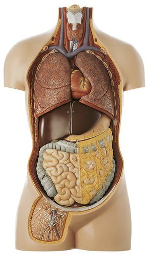 Natural size in SOMSO-Plast®. Separates into 12 parts: half of each lung (2) heart (2) liver stomach duodenum with pancreas small and large intestine opening appendix bladder half kidney torso. On a green base. Height: torso 67 cm.