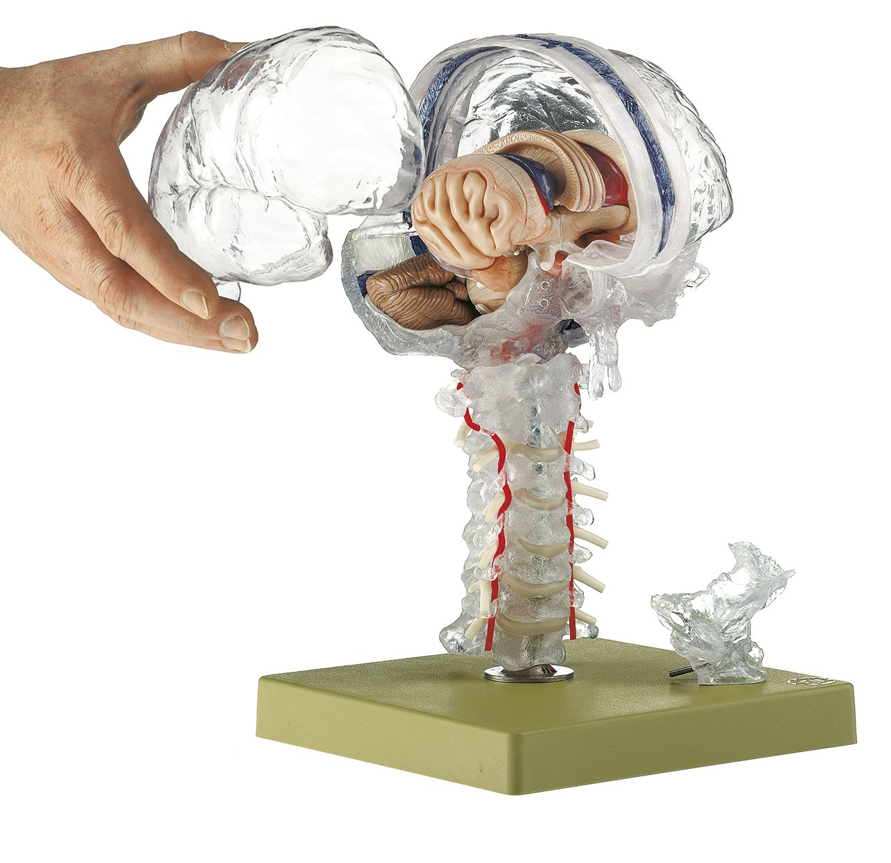 Natural size in SOMSO-Plast. After Prof. Dr. J. W. Rohen Department of Anatomy of the University Erlangen. Separates into 15 parts: transparent left cortex of the brain with sinus sagittalis connected with part of the base of the skull the cervical vertebral column with spinal cord and vertebral artery right transparent cortex of the brain right half of the sphenoid bone removable brain stem (separates into right and left halves) right and left insular cortex left striate body right capsular interna corpus callosum fornix limbic system and ventricle system as a whole right and left halves of the cerebellum. On a stand with base.