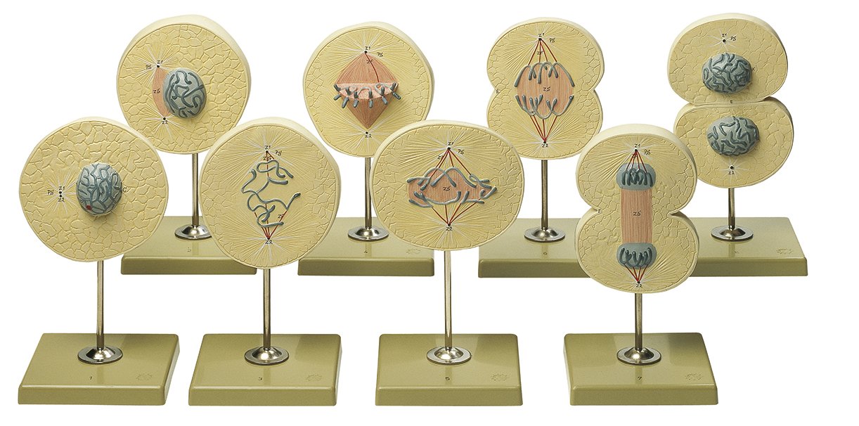 Enlarged many times in SOMSO-Plast®. Shown by 8 models: Prophase metaphase anaphase and telophase. These models allow one to follow the process of indirect division (mitosis) in the living cell seen photomicroscopically. Individually mounted on stands with green bases.