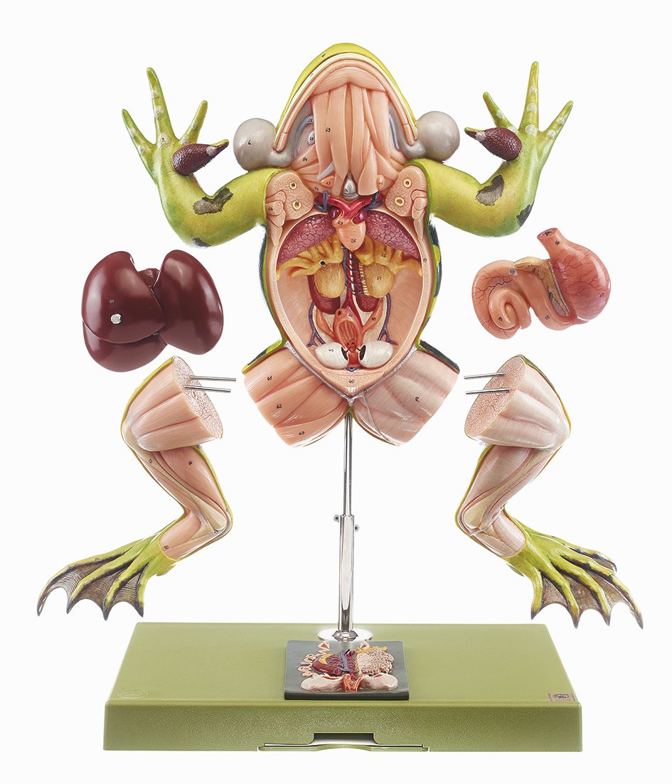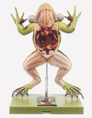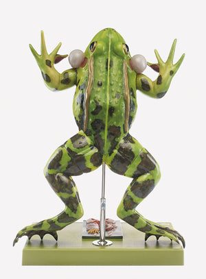 Rana esculenta. After Christian Groß Head of Biology Department (retired). Enlarged approx. 4 times in SOMSO-Plast®. The model shows a male water frog with spread out legs and inflated vocal sacs. The back view shows the characteristics of form colour and marking. Liver and stomach-intestine-tract are removable to show the position of the internal organs in stages. The hind legs can be removed at the thighs. The urinary and genital organs of a female water frog are shown on a supplementary model for comparison. Separates into 5 parts. On a stand and green base.
