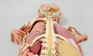 This 3D printed specimen presents a unique view of axial anatomy, presenting a dorsal deep dissection of the head, neck, axillae, thorax, abdomen, and gluteal regions. The removal of the posterior portions of the cranium and laminectomy from the cervical region to the opening of the sacral canal affords a continuous view of the central nervous system structures and origin of the segmental nerves relative to other axillary and appendicular structures.